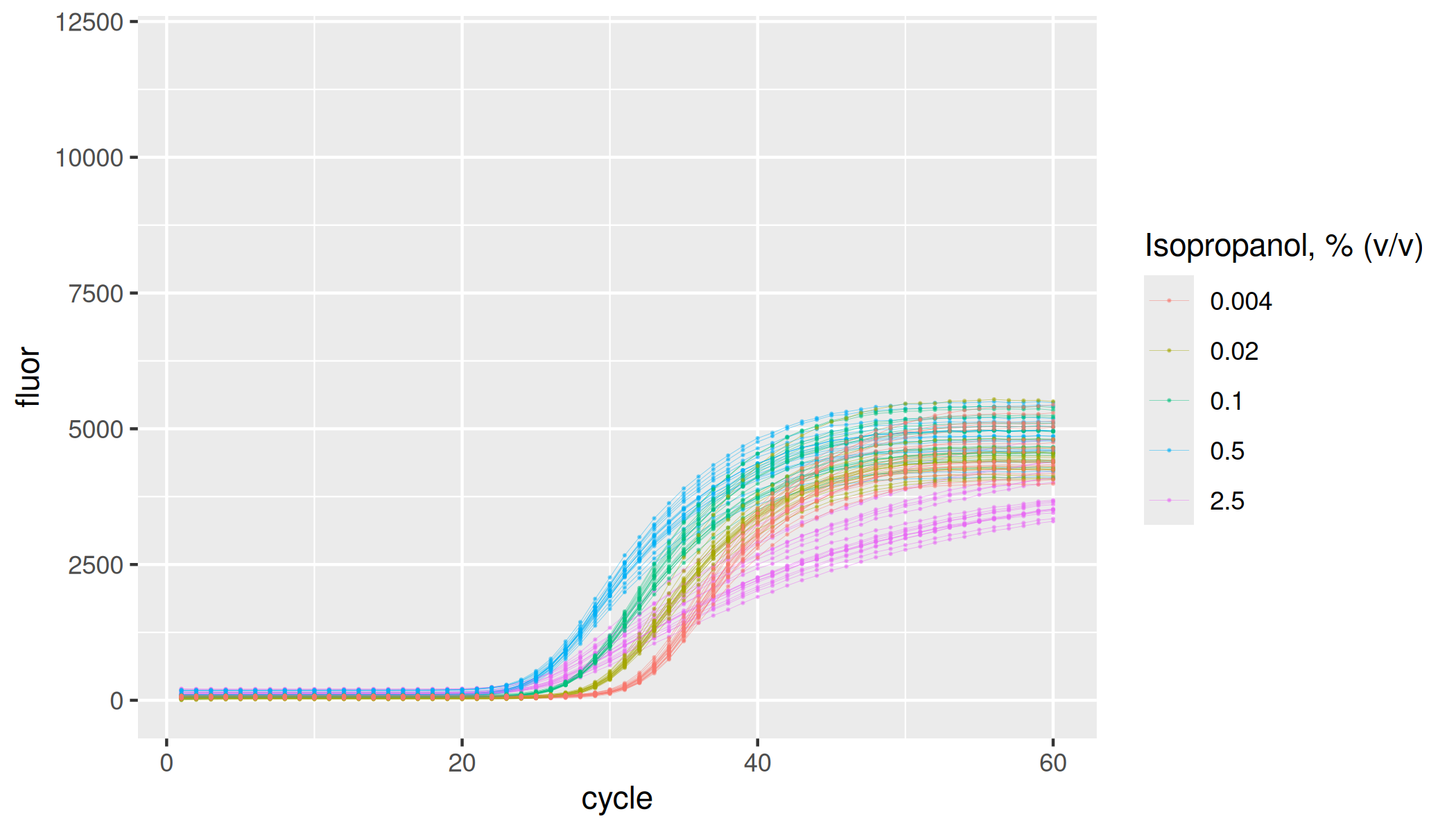 ggplot(aes(x = cycle, y = fluor, group = interaction(plate, inhibitor, inhibitor_conc, replicate), col = as.factor(inhibitor_conc))) +