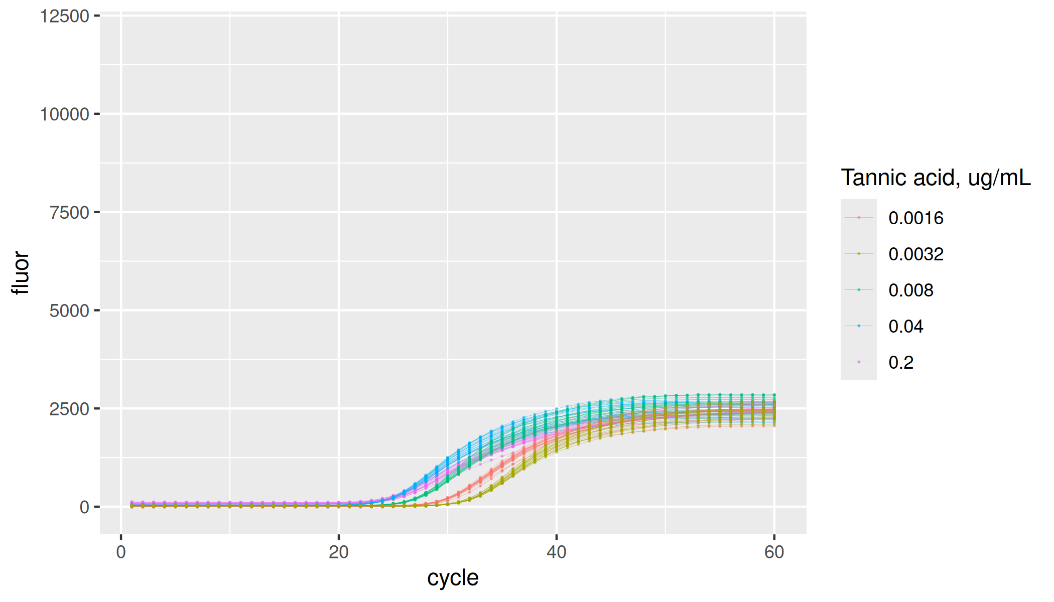 #> 15 soy+tannic acid tannic acid 0.2 100000 1 18Most concentrated set of replicates in the dilution series have 100,000 copies of the soybean Lectin endogene (Le1) derived amplicon. Following samples in the series are five-fold dilutions.