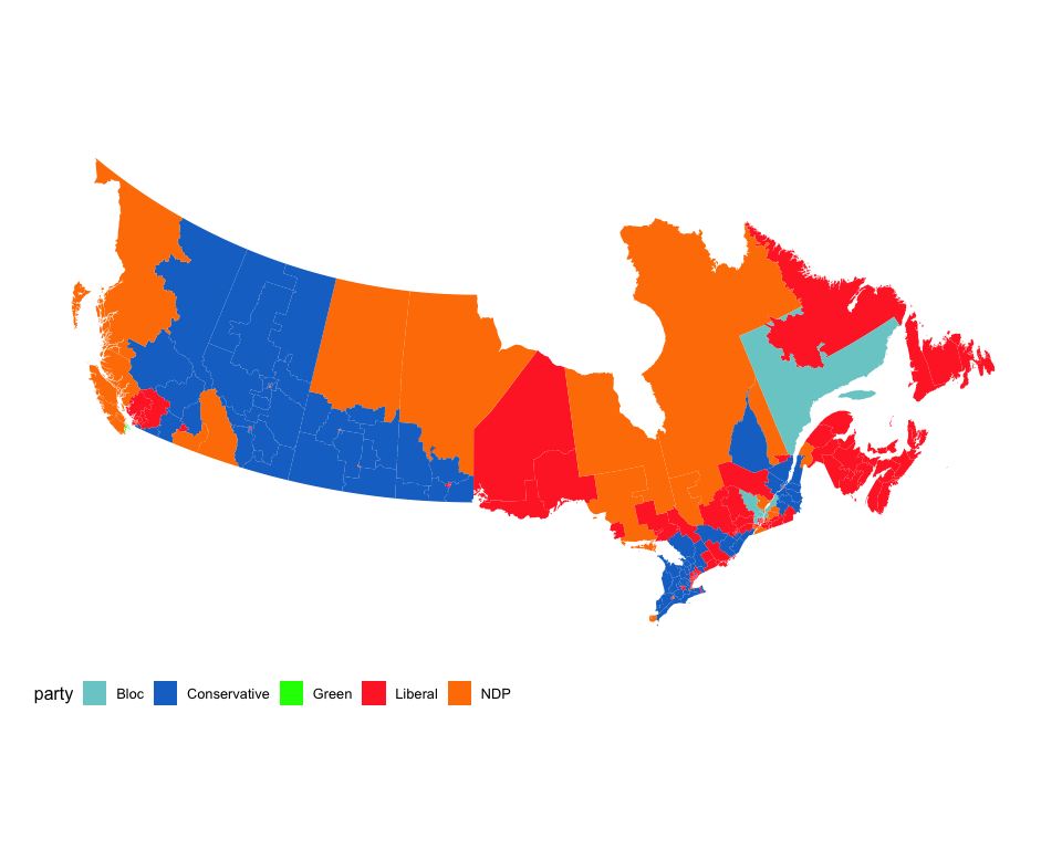 Perhaps you are interested in provincial election results, not federal election results. That is also ok. Try plotting the Quebec 2018 provincial election results: