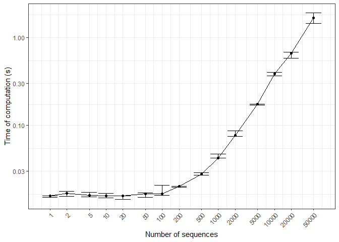 ggplot2::labs(x = "Number of sequences", y = "Time of computation (s)")