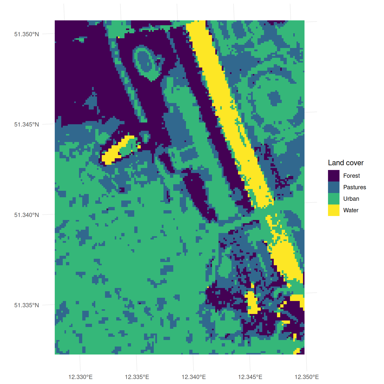 leipzig_raster = rast(system.file("extdata", "leipzig_raster.tif", package = "mlr3spatial"))The function as_task_classif_st() converts the sf::sf object to a spatial classification task.