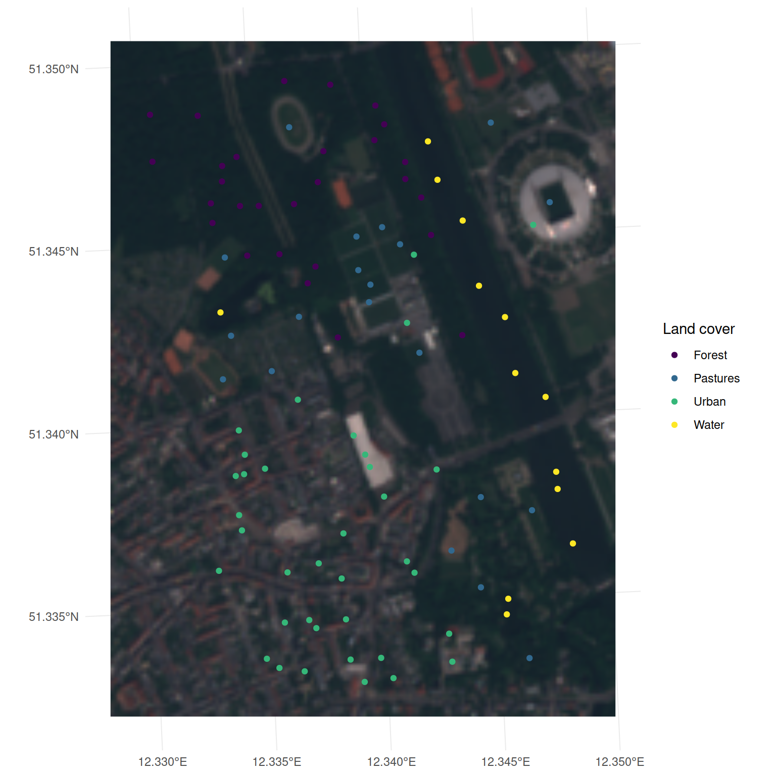 Our goal is to map the land cover of the city of Leipzig. The mlr3spatial package contains a Sentinel-2 scene of the city of Leipzig and a point vector with training sites. The Sentinel-2 scene is a 10m resolution multispectral image with 7 bands and the NDVI. The points represent samples of the four land cover classes: Forest, Pastures, Urban and Water. We load the raster with the terra package and the vector with the sf package in the R Session.
