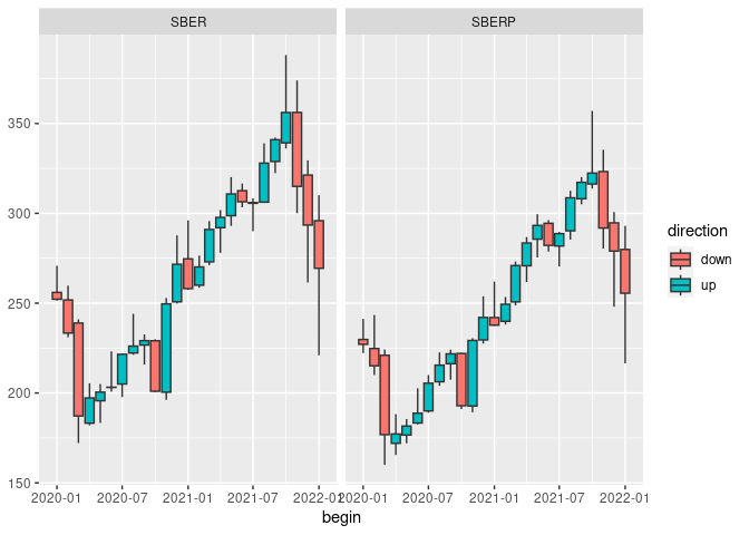 get_candles() is vectorised over secid, so it is possible to, say, fetch candles for both the common and the preferred shares. The returned object has class MoexCandles for which there’s an appropriate plot() method: