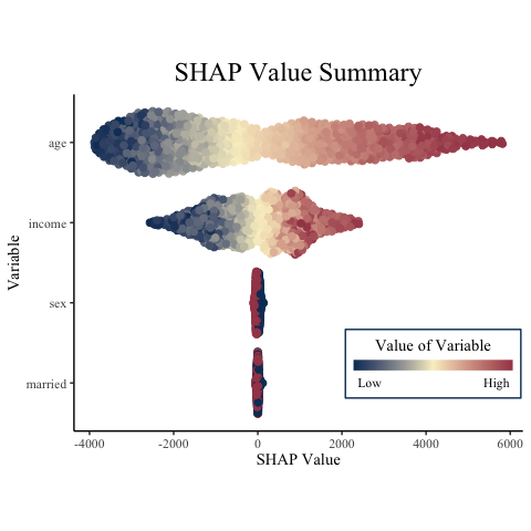 visualize SHAP values in R. What is show here are the default outputs,