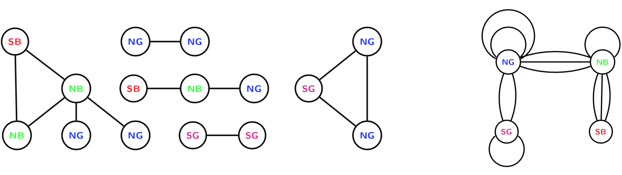 Multigraphs are network representations in which multiple edges and edge loops (self edges) are permitted. These data structures can be either directly observed or aggregated by classifying or cross-classifying node attributes into meta nodes. For the latter case, within group edges correspond to self-edges. See example below where the original graph with 15 nodes and 12 edges (left) is aggregated based on node categories into a small multigraph with 4 nodes (right).