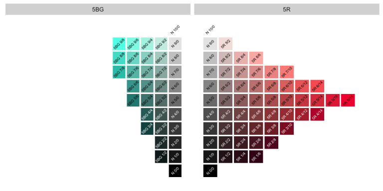 The munsell package provides easy access to, and manipulation of, the Munsell colours. The munsell package provides a mapping between Munsell’s original notation (e.g. “5R 5/10”) and hexadecimal sRGB strings suitable for use directly in R graphics. The package also provides utilities to explore slices through the Munsell colour tree, to transform Munsell colours and display colour palettes.