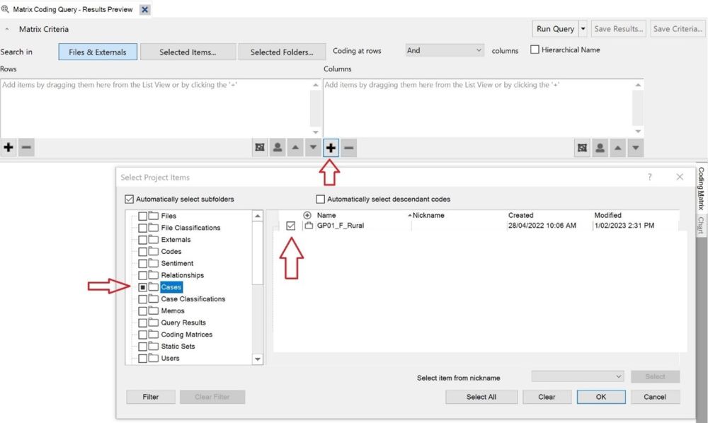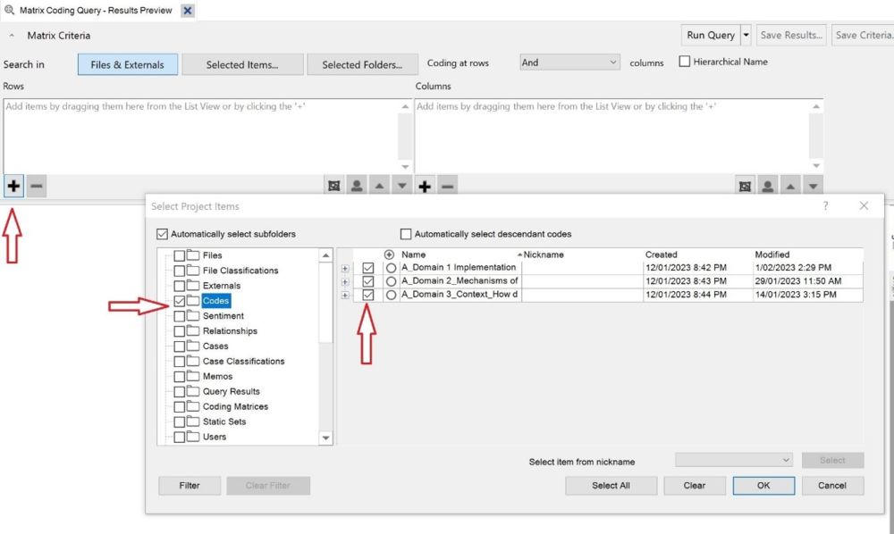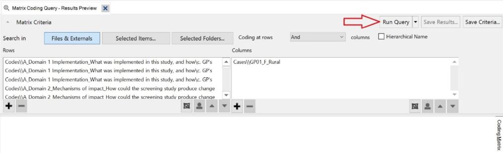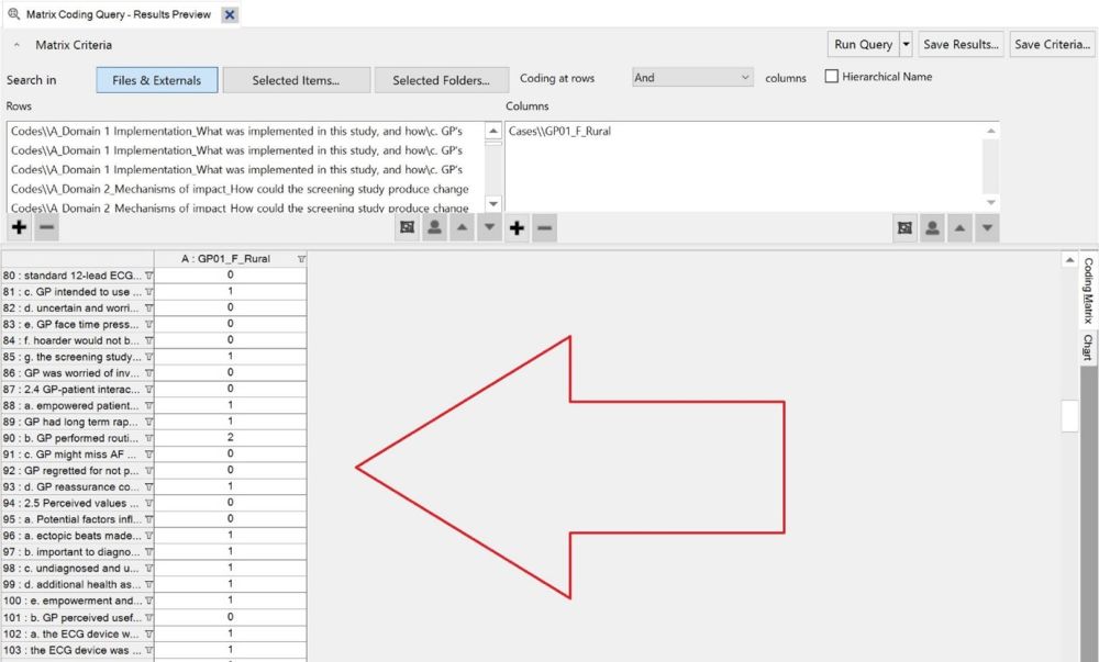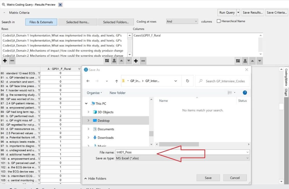 interview_num is the upcoming interview number where these refinements will take effect. At the time of writing, this is the only column that is used by the package; the rest is for your record-keeping.refinement_type is free text where you can describe the kind of refinement you made, e.g. “add” or “rephrase” or “remove”.refinement is the actual text that has been changed.reason describes the rationale behind the refinement.other is for additional information you may want to include.For our purposes, a coding matrix is an Excel spreadsheet where each row is a unique code, and each column shows how many times that code was mentioned in one interview. NVivo’s Matrix Coding Query tool can produce spreadsheets in the correct format, which we detail below.