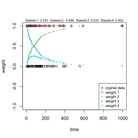 tmpd <- with(lung, data.frame(time = SurvTime, stat = 1-censor, grp = Treatment))Generate the weight functions for maxcombo test