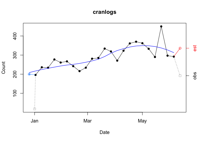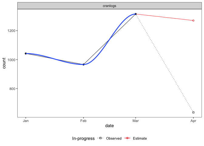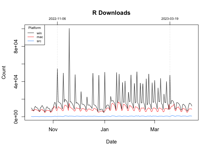 cranDownloads(pro.mode = TRUE) before that date, you’ll see