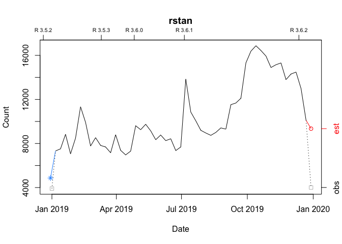 cranDownloads(packages = "HistData", from = "2020-02", to = "2020-02")Let’s say you want the download counts for ‘rstan’ for 2020.