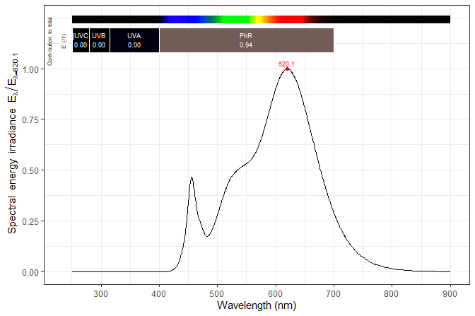 #> Spectral data normalized to s.e.irrad = 1 at 620.12 nm (max in 251.29-900 nm)