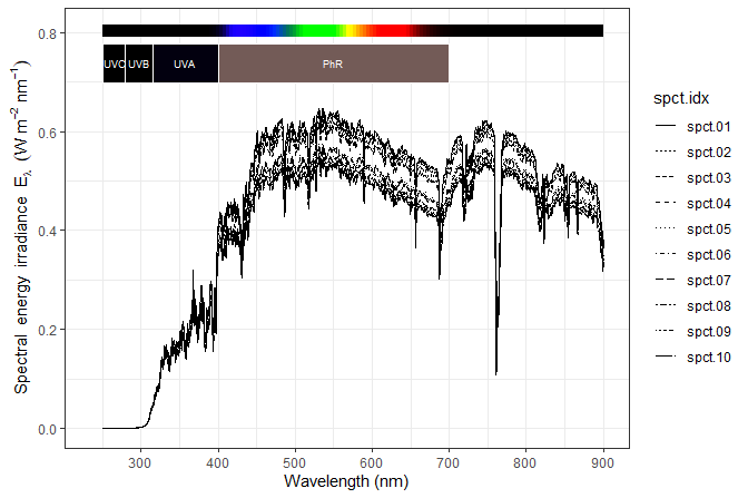 #> [5] "WMO.Wehrli.AM0"Summary calculations can be easily done with methods from package ‘photobiology’. Here we calculate photon irradiance with function q_irrad() for another collection of spectra. As the spectra are normalised we pass allow.scaled = TRUE,