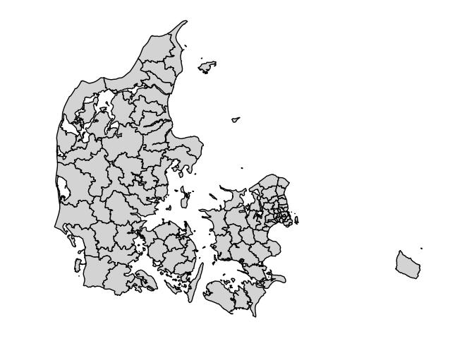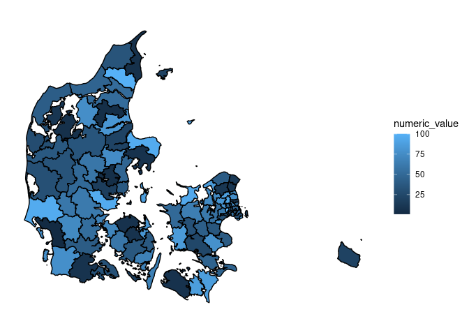 To fill the maps with values, first generate or load a data set containing one row per entity, with a valid ID column and a value column to be plotted. plotDK contains information of valid ID’s. For municipalities this data is saved in: