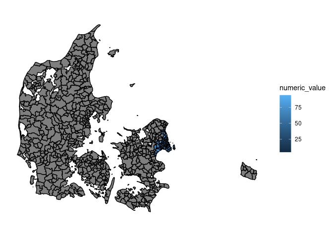 plotDK provides easy access to plot summary statistics as choropleth maps of danish administrative areas. plotDK supports geoms for danish regions, provices, municipalities, and zipcodes.