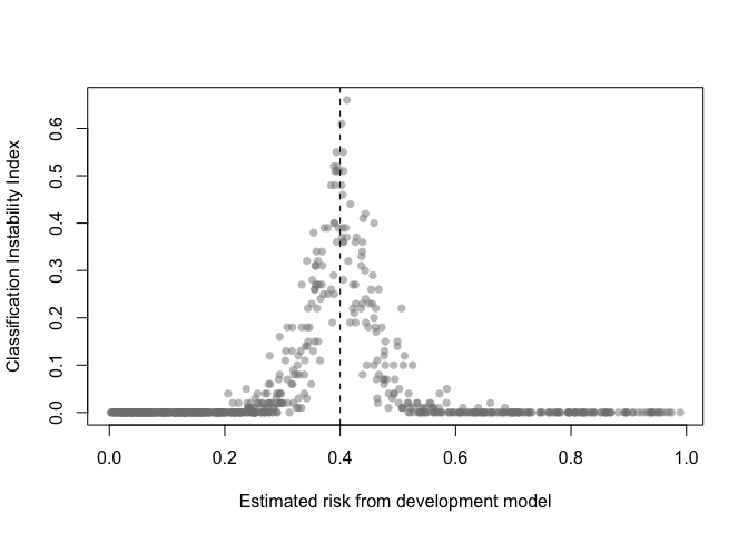 The classification instability index (CII) is the proportion of individuals that change predicted class (present/absent, 1/0) when predicted risk is compared to some threshold. For example, a patient predicted to be in class 1 would receive a CII of 0.3 if 30% of the bootstrap models led to a predicted class of 0.
