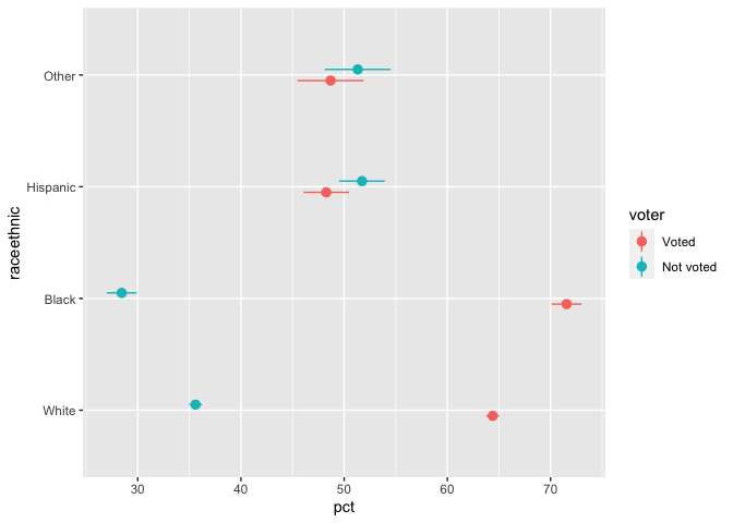 ggplot(aes(x = pct, y = raceethnic, xmin = (pct - moe), xmax = (pct + moe), color = voter)) +