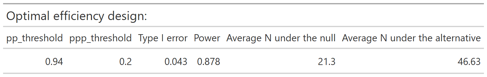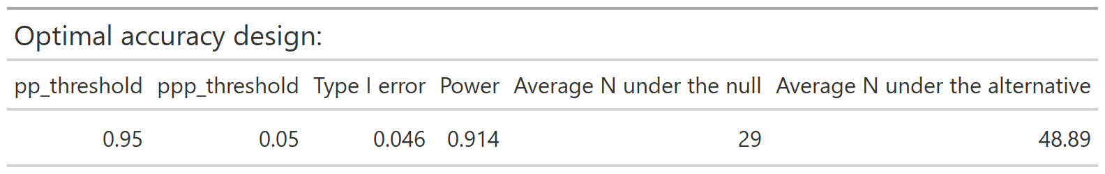 The optimal accuracy and optimal efficiency designs can be obtained by passing the results to the optimize_design() function, with filtering applied for the desired range of type 1 error and minimum power.