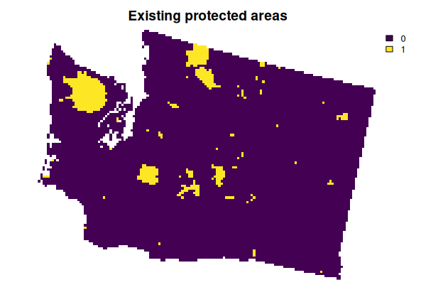 plot(wa_locked_in, main = "Existing protected areas", axes = FALSE)