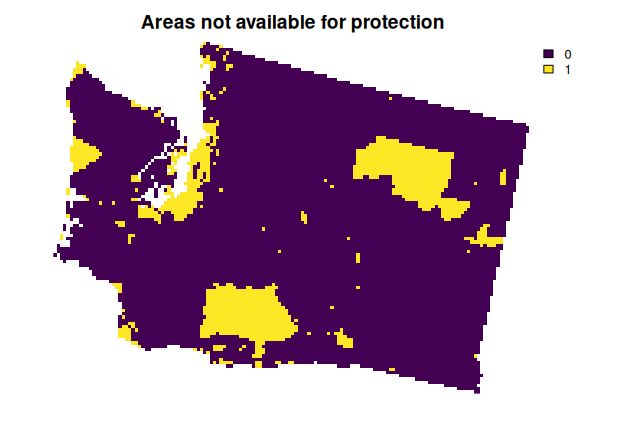 plot(wa_locked_out, main = "Areas not available for protection", axes = FALSE)