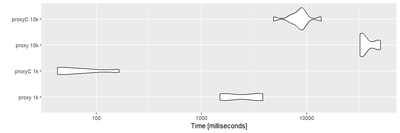 dm10k <- as.matrix(sm10k)With sparse matrices, proxyC is roughly 10 to 100 times faster than proxy.