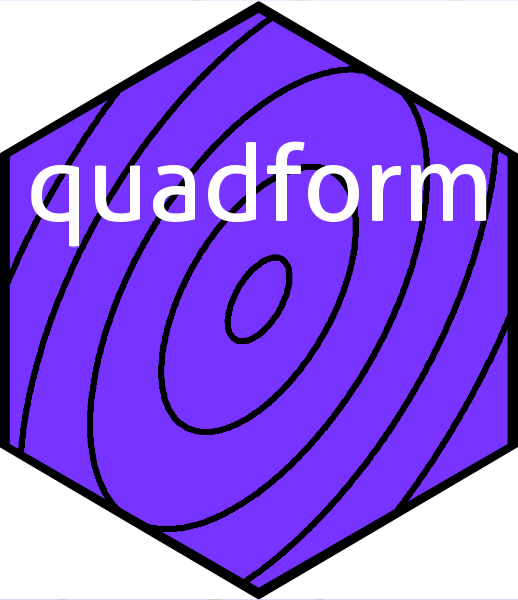 Quadratic forms are polynomials with all terms of degree 2. Given a column vector \({\mathbf x}=(x_1,\ldots,x_n)^\top\) and an \(n\times n\) matrix \(M\) then the function \(f\colon\mathbb{R}^n\longrightarrow\mathbb{R}\) given by \(f({\mathbf x})=x^TMx\) is a quadratic form; we extend to complex vectors by mapping \({\mathbf z}=(z_1,\ldots, z_n)^\top\) to \({\mathbf z}^*M{\mathbf z}\), where \(z^*\) means the complex conjugate of \(z^T\). These are implemented in the package with quad.form(M,x) which is essentially