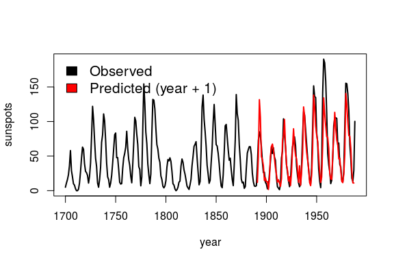 legend( 'topleft', legend = c( "Observed", "Predicted (year + 1)" ),