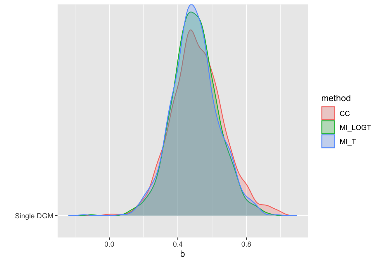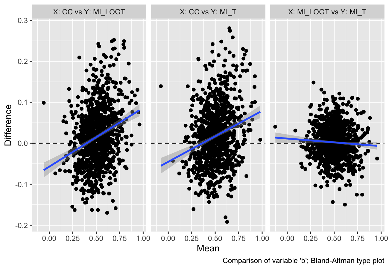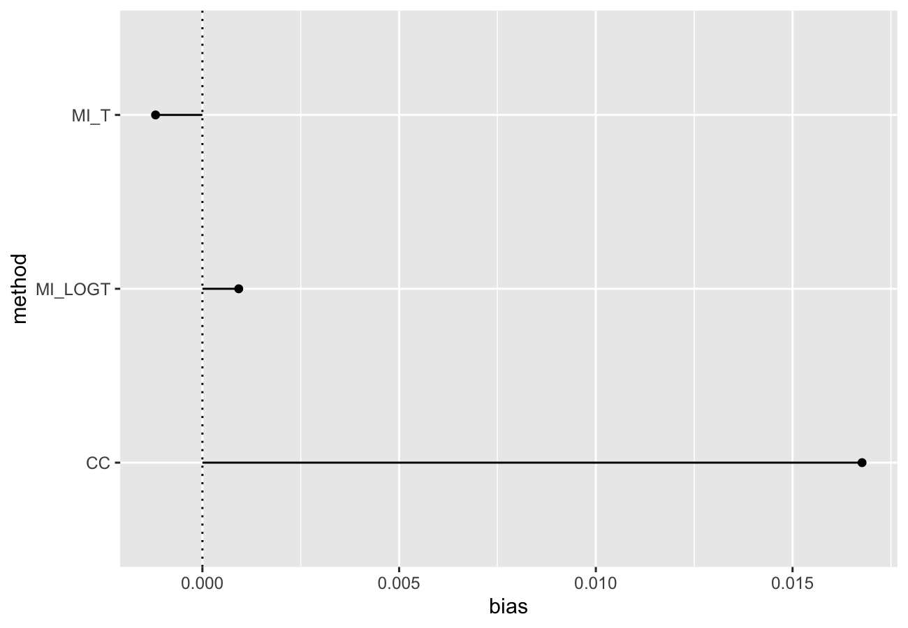 s <- simsum(data = MIsim, estvarname = "b", true = 0.5, se = "se", methodvar = "method", x = TRUE)