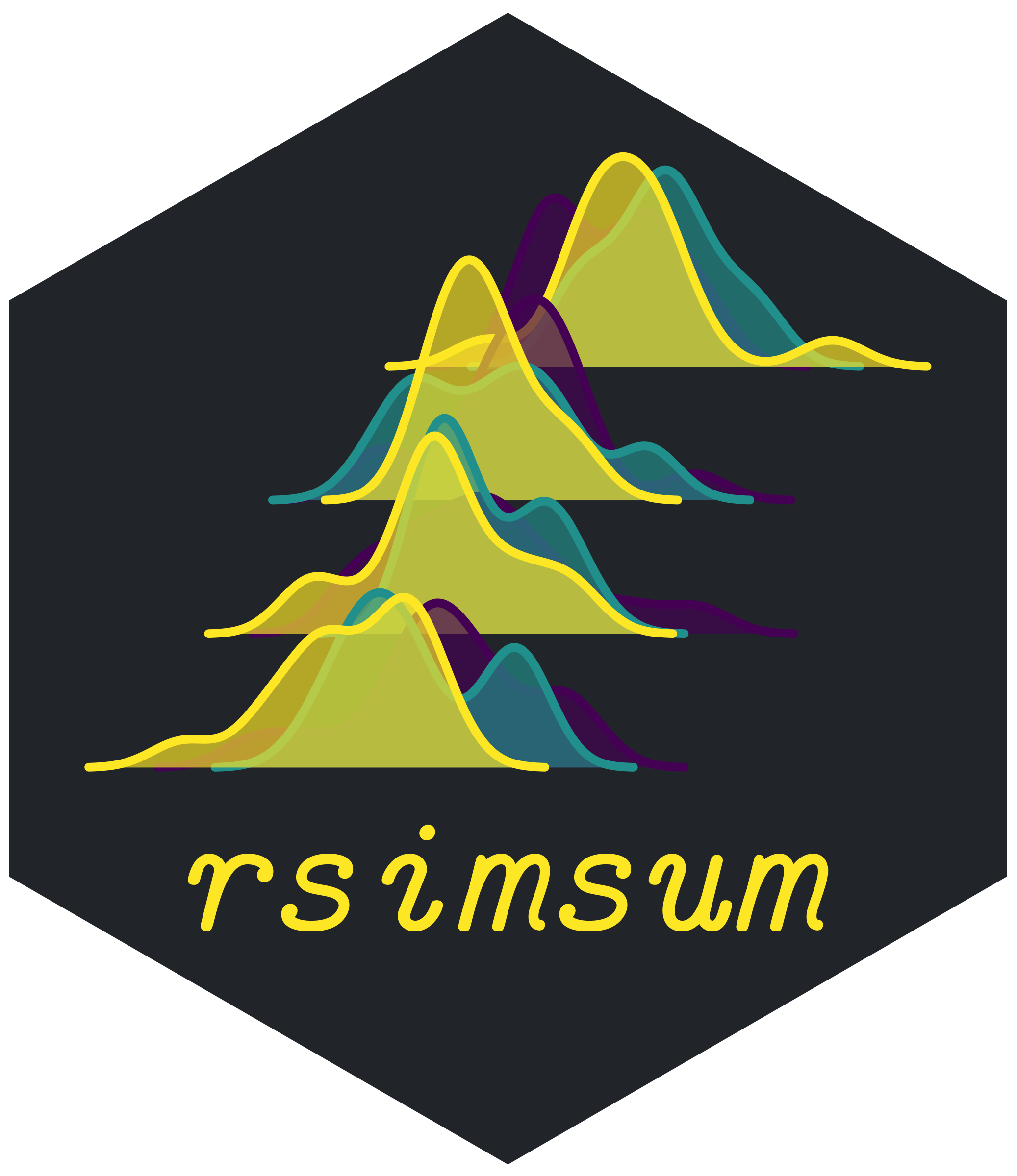 The main function of rsimsum is called simsum and can handle simulation studies with a single estimand of interest at a time. Missing values are excluded by default, and it is possible to define boundary values to drop estimated values or standard errors exceeding such limits. It is possible to define a variable representing methods compared with the simulation study, and it is possible to define by factors, that is, factors that vary between the different simulated scenarios (data-generating mechanisms, DGMs). However, methods and DGMs are not strictly required: in that case, a simulation study with a single scenario and a single method is assumed. Finally, rsimsum provides a function named multisimsum that allows summarising simulation studies with multiple estimands as well.