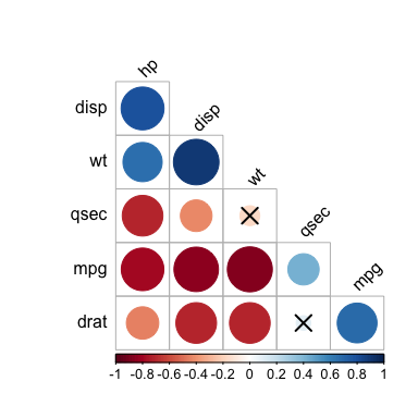 coefficients, in a matrix, by symbols according to the value.cor_plot(): visualize correlation matrix using base