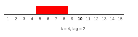 lag denotes how many observations windows will be lagged by. If lag is a single value than it is constant for all elements of x. For varying lag size one should specify lag as integer vector of length(lag) == length(x) where each element of lag defines lag of window. Default value of lag = 0. Example below illustrates window of k = 4 lagged by lag = 2 for 10-th element of vector x. Lag can also be negative value, which shifts window forward instead of backward.