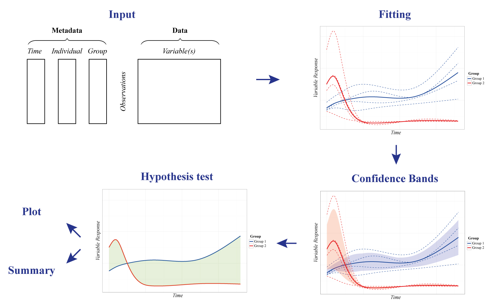 Analytes levels are descriptive of the underlying biological state and evolve smoothly through time. For a single analyte, the time trajectory of each individual is described with a smooth curve estimated by smoothing splines. For a group of individuals, a curve representing the group mean trajectory is also calculated. These individual and group mean curves become the new observational unit for subsequent data analysis, that is, the estimation of the intra-class variability and the identification of trajectories significantly altered between groups.