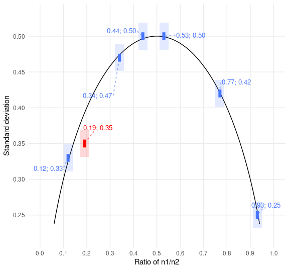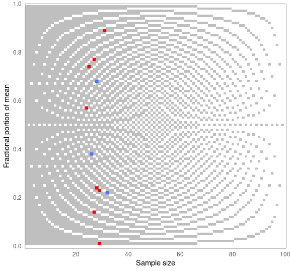 #> 6 0.554 150 FALSE 0.85You can choose how the means are reconstructed for testing — below, rounded up from 5. When visualizing results, the plot will adjust automatically. Blue dots are consistent values, red dots are inconsistent ones: