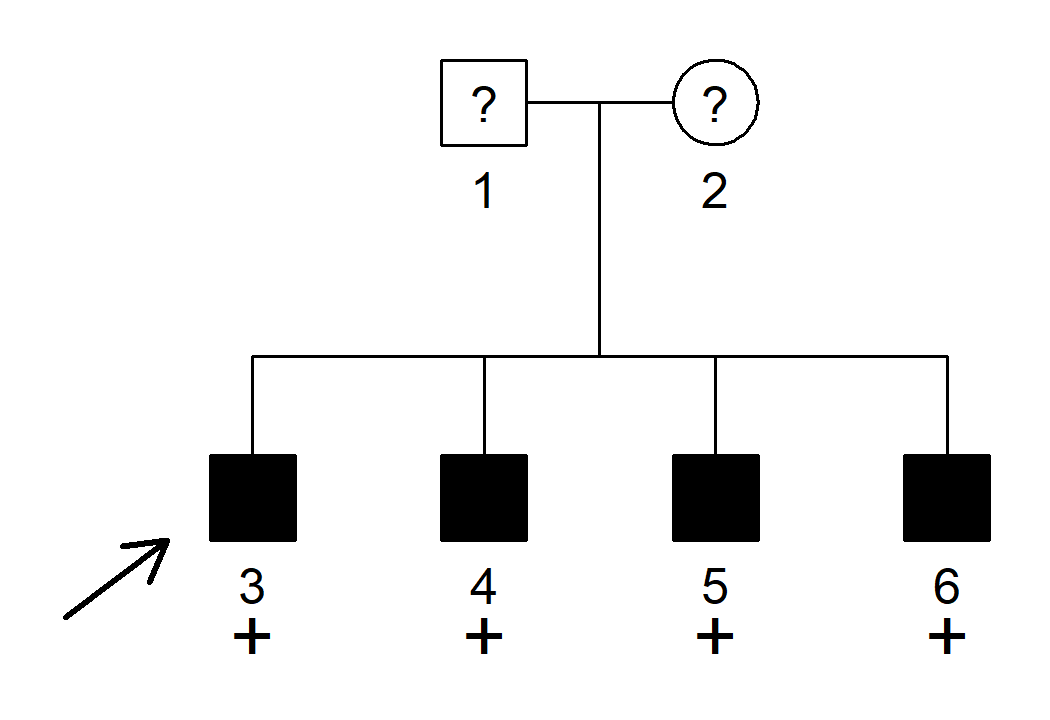 devtools::install_github("magnusdv/segregatr")library(segregatr)The family below shows four brothers, all affected with a rare dominant disease with 90% penetrance and phenocopy rate 1%. The parents have unknown affection status. All four brothers are shown to carry a candidate variant.