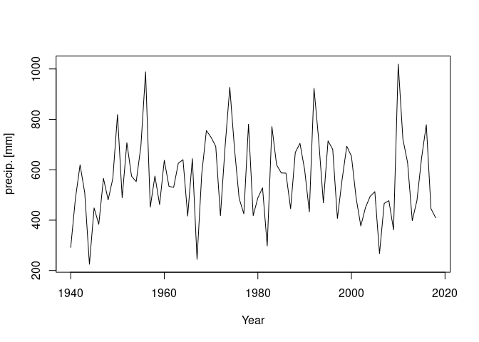 plot(WaggaWagga$Year,WaggaWagga$Precipitation,type='l',xlab='Year',ylab='precip. [mm]')