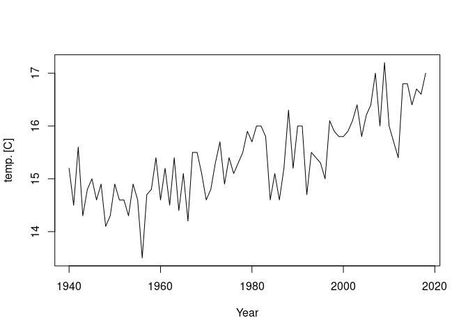 plot(WaggaWagga$Year,WaggaWagga$Temperature,type='l',xlab='Year',ylab='temp. [C]')
