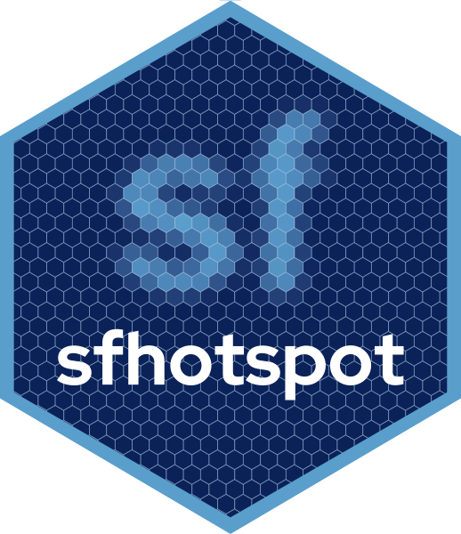 sfhotspot provides functions to identify and understand clusters of points (typically representing the locations of places or events). All the functions in the package work on and produce simple features (SF) objects, which means they can be used as part of modern spatial analysis in R.