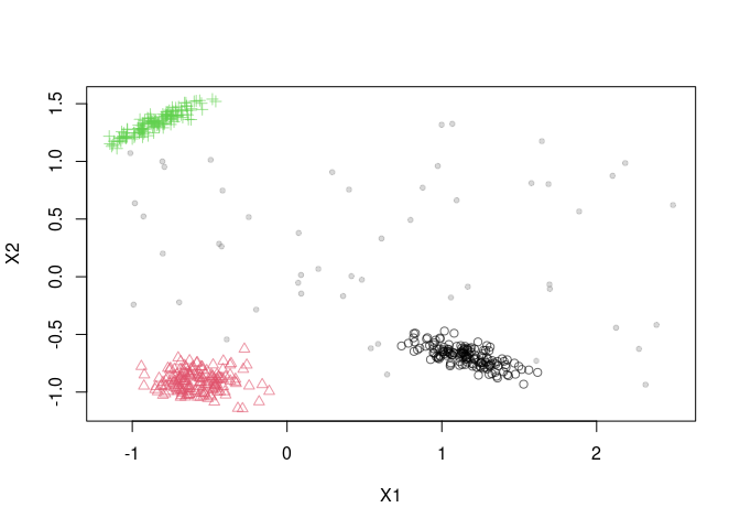"https://cloud.r-project.org/"))Load the package and a random data stream with 3 Gaussian clusters and 10% noise and scale the data to z-scores.