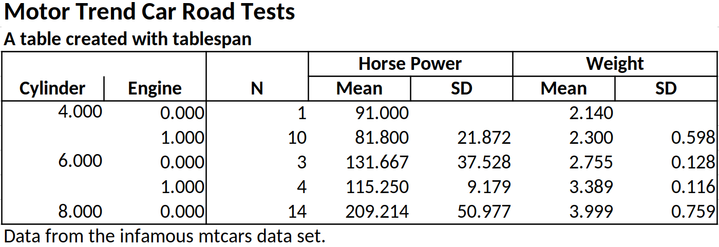 #> Data from the infamous mtcars data set.Tables created with tablespan can now be translated to