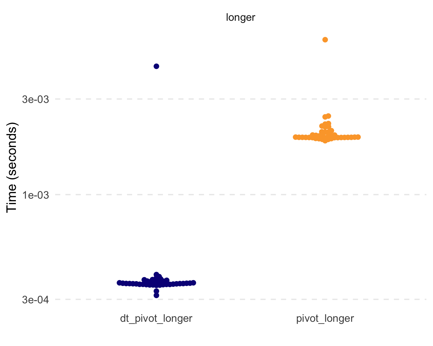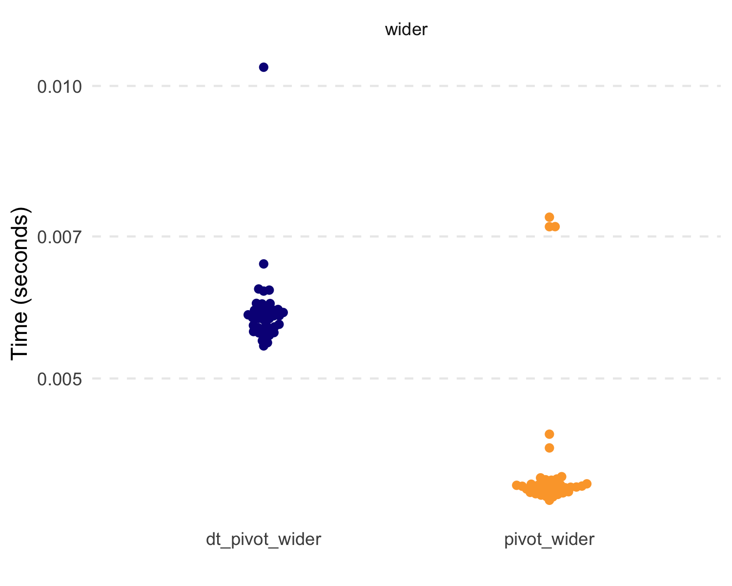 #> 1000000: 0.6268181 0.7851774 1 100000 7 thing2Speed comparisons (similar to those shown in the preprint) are highlighted below. Notably, the timings are without the nested1 and nested2 columns of the original dt object from above. Also, all dplyr and tidyr functions use a tbl version of the dt table.