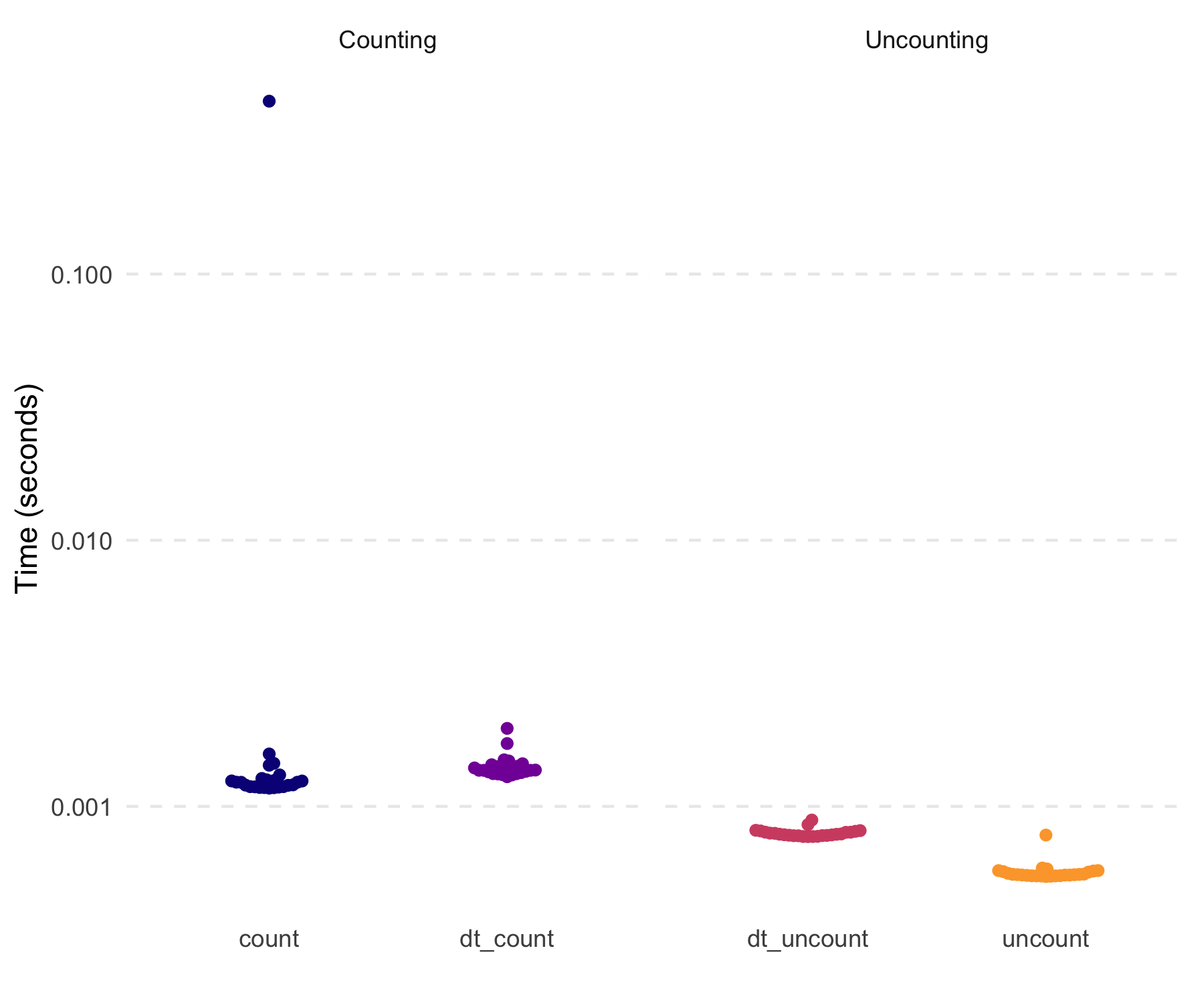 The dt_count() function does essentially what dplyr::count() does. Notably, this, unlike the majority of other dt_ functions, wraps a very simple statement in data.table. That is, data.table makes getting counts very simple and concise. Nonetheless, dt_count() fits the general API of tidyfast. To some degree, dt_uncount() is also a fairly simple wrapper, although the approach may not be as straightforward as that for dt_count().