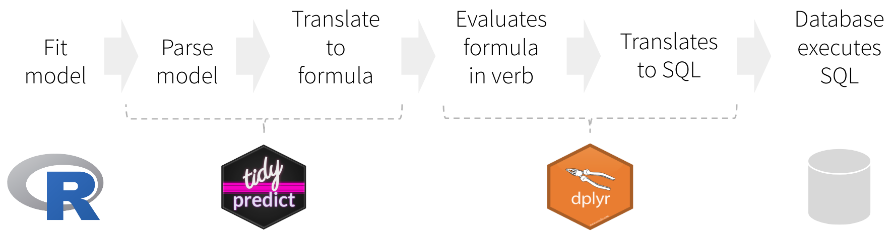 Instead of translating directly to a SQL statement, tidypredict creates an R formula. That formula can then be used inside dplyr. The overall workflow would be as illustrated in the image above, and described here: