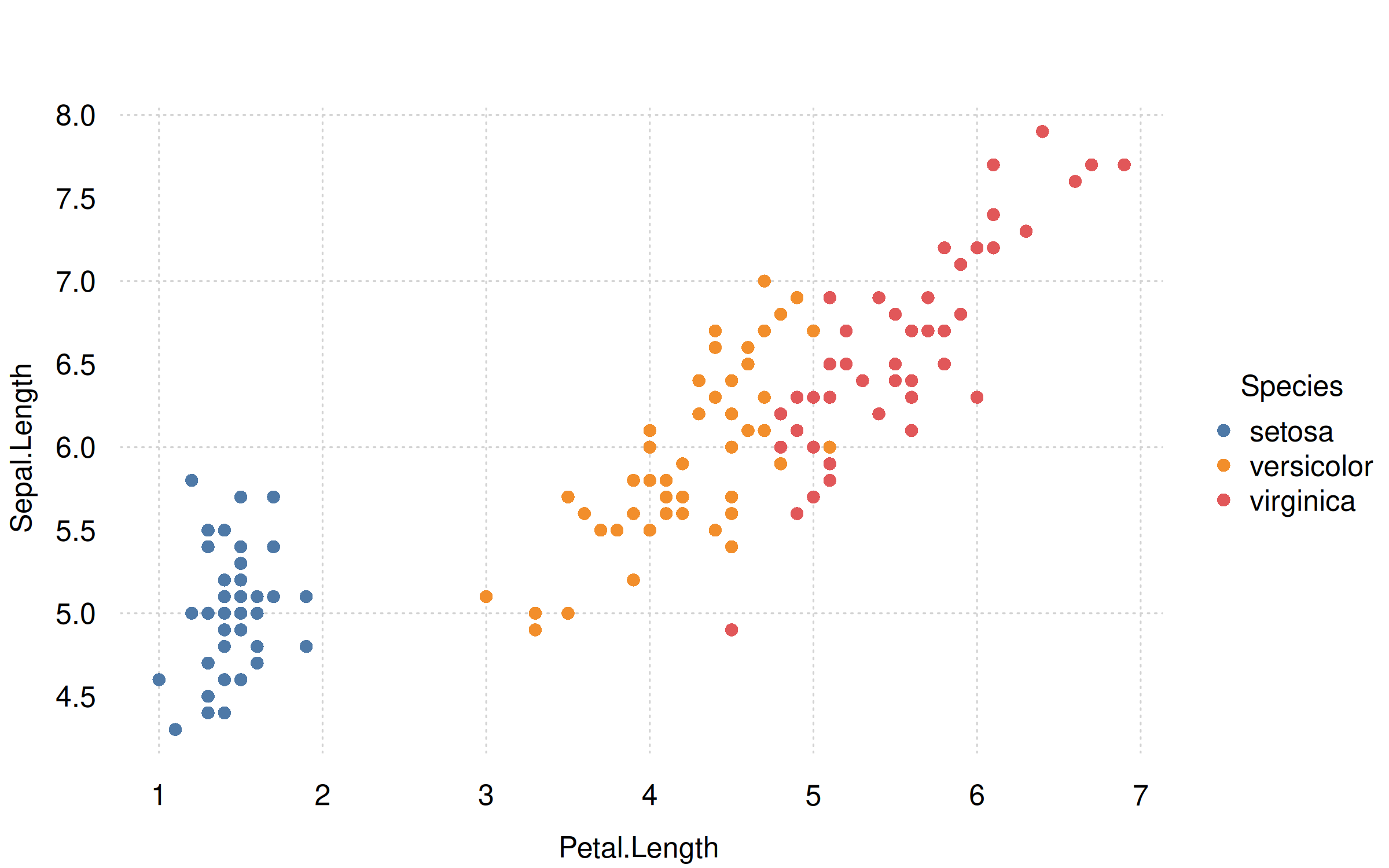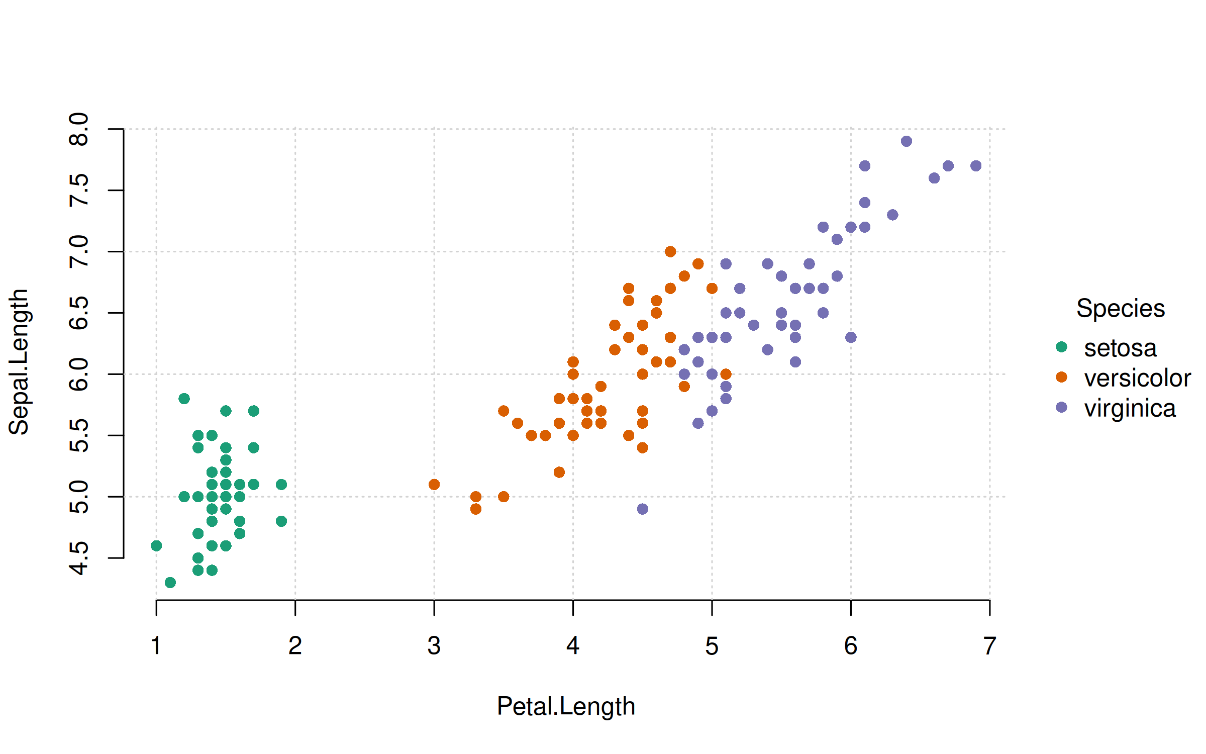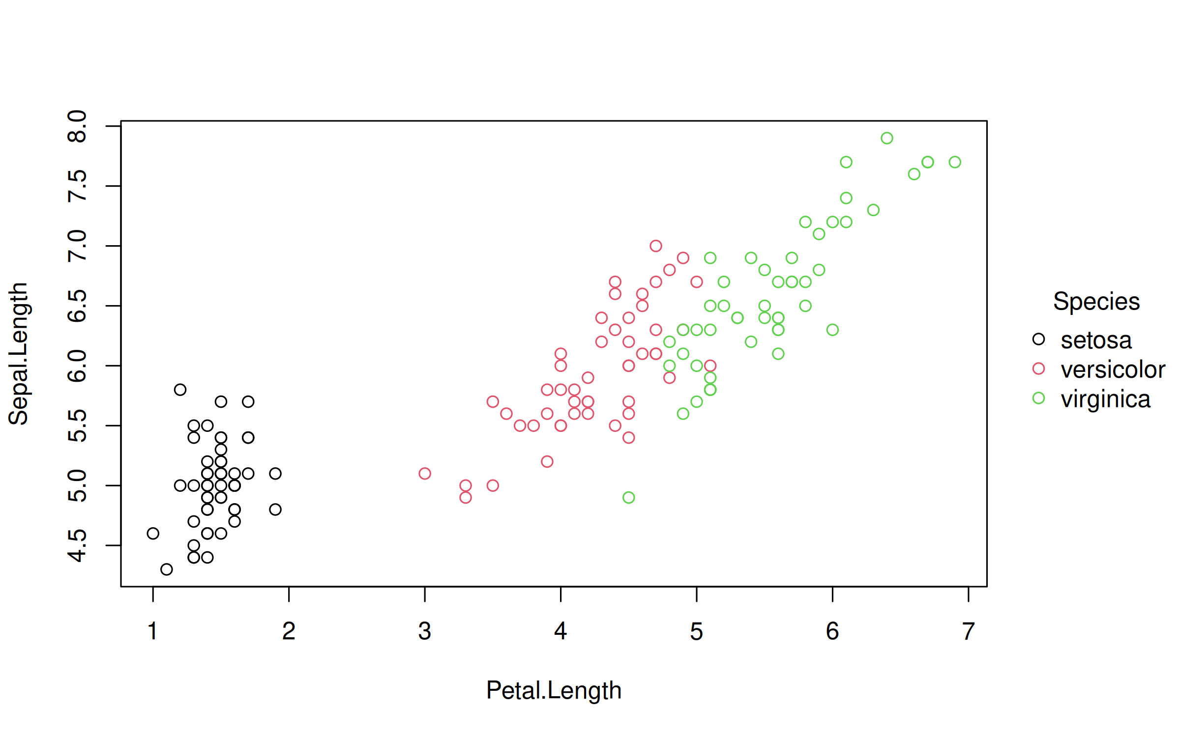 # with(iris, tinyplot(x = Petal.Length, y = Sepal.Length, by = Species)) # atomic