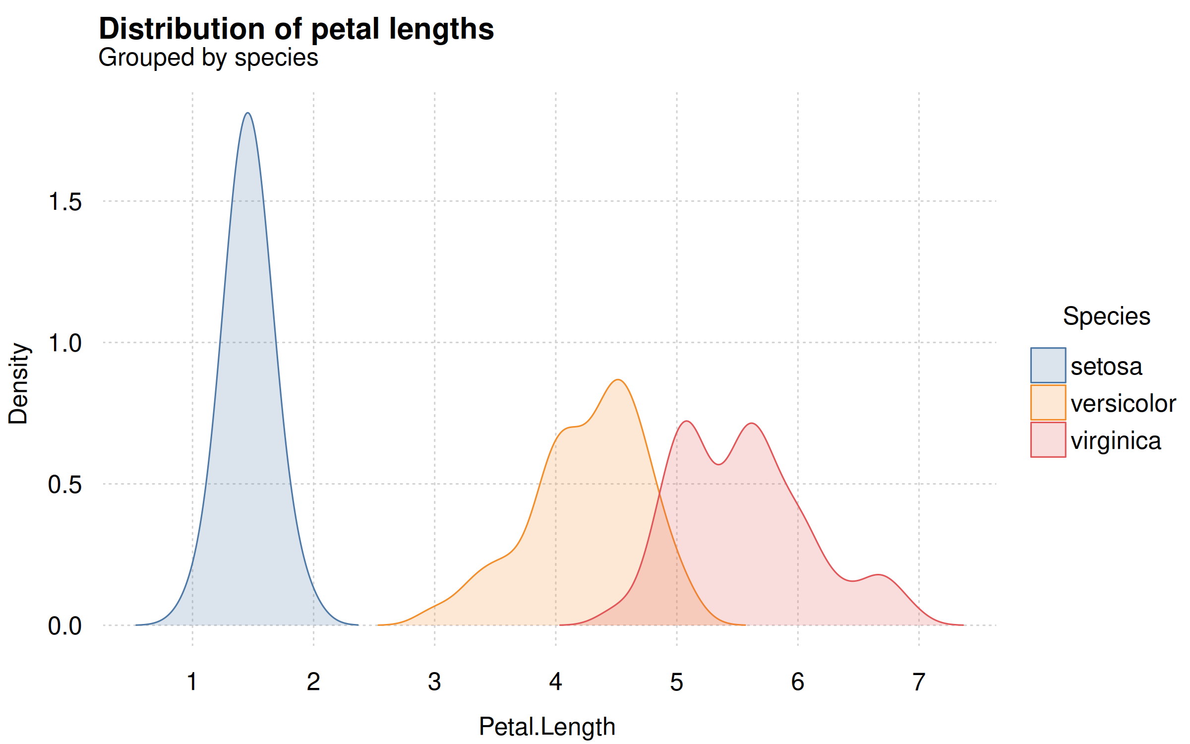 Themes are persistent and will be applied to subsequent plots. For example, here is a grouped density plot:
