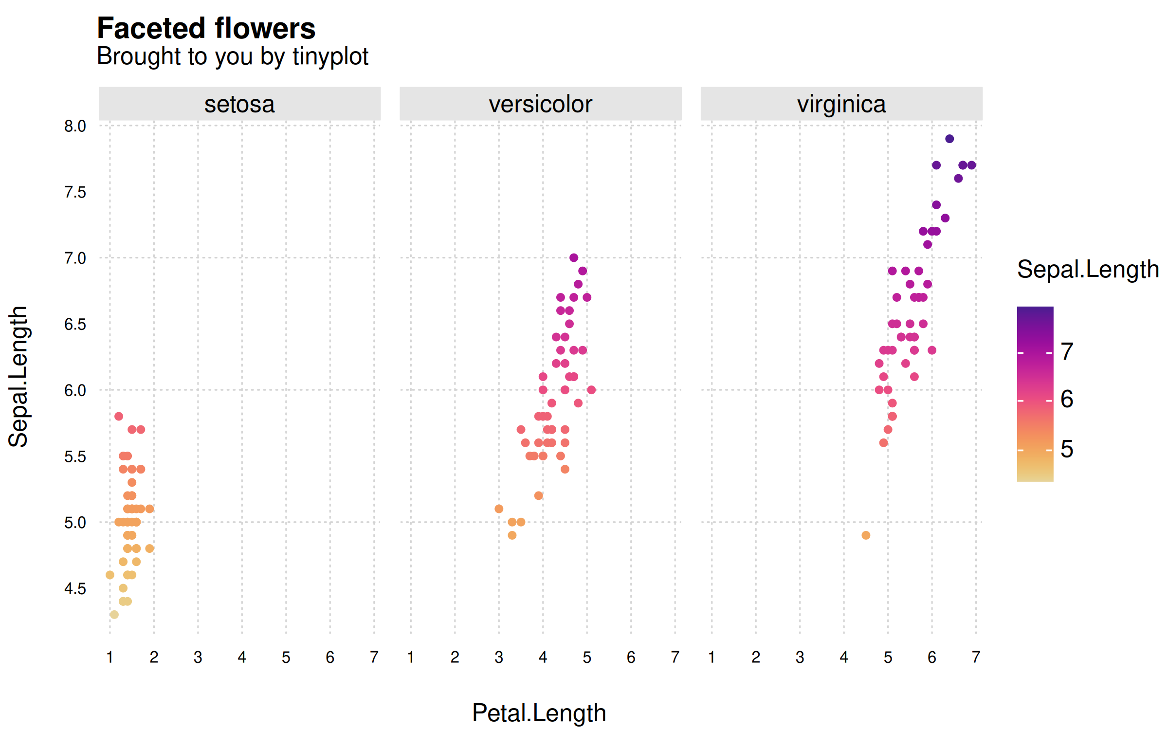 main = "Faceted flowers", sub = "Brought to you by tinyplot"