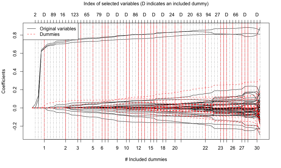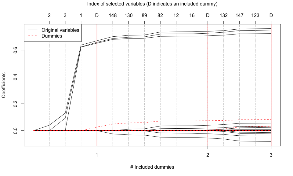 XD <- cbind(X, dummies)mod_tlars <- tlars_model(X = XD, y = y, num_dummies = num_dummies)