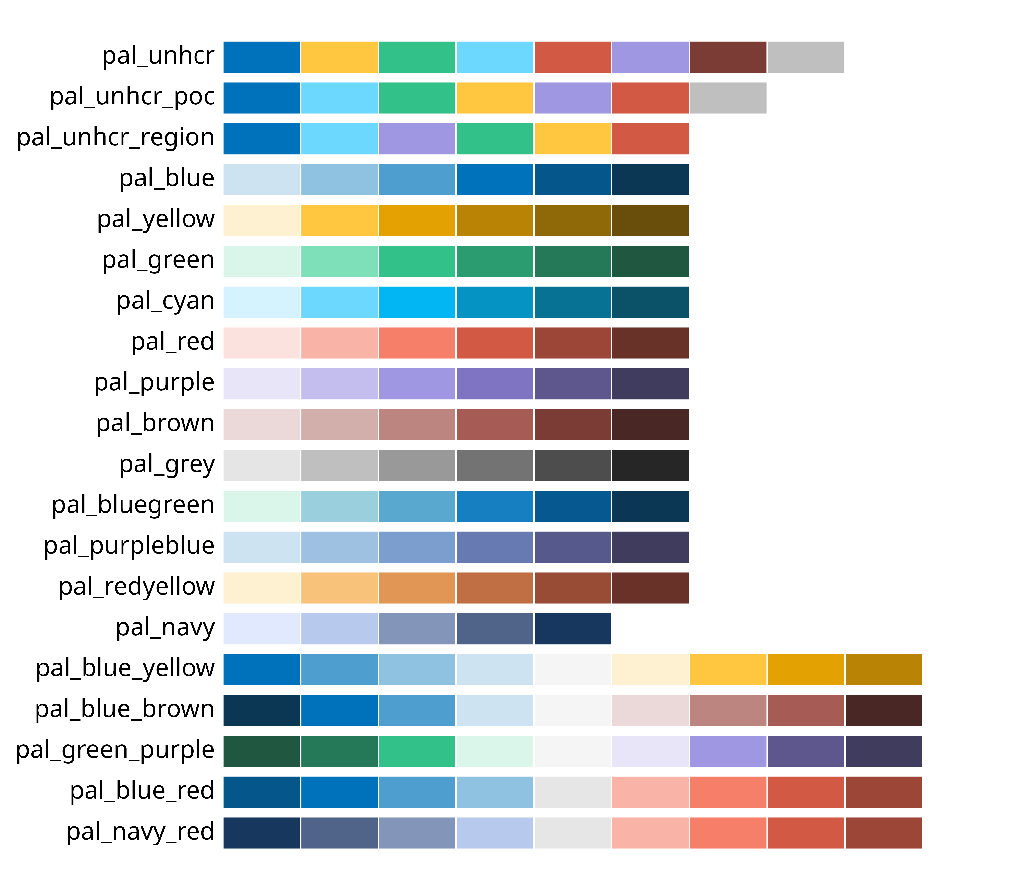 Simplify the creation of your data visualizations with the {unhcrthemes} R package. It is designed to align your plots with UNHCR’s data visualization recommendations. This package offers a comprehensive {ggplot2} theme, including built-in customizations and thoughtfully crafted color palettes.