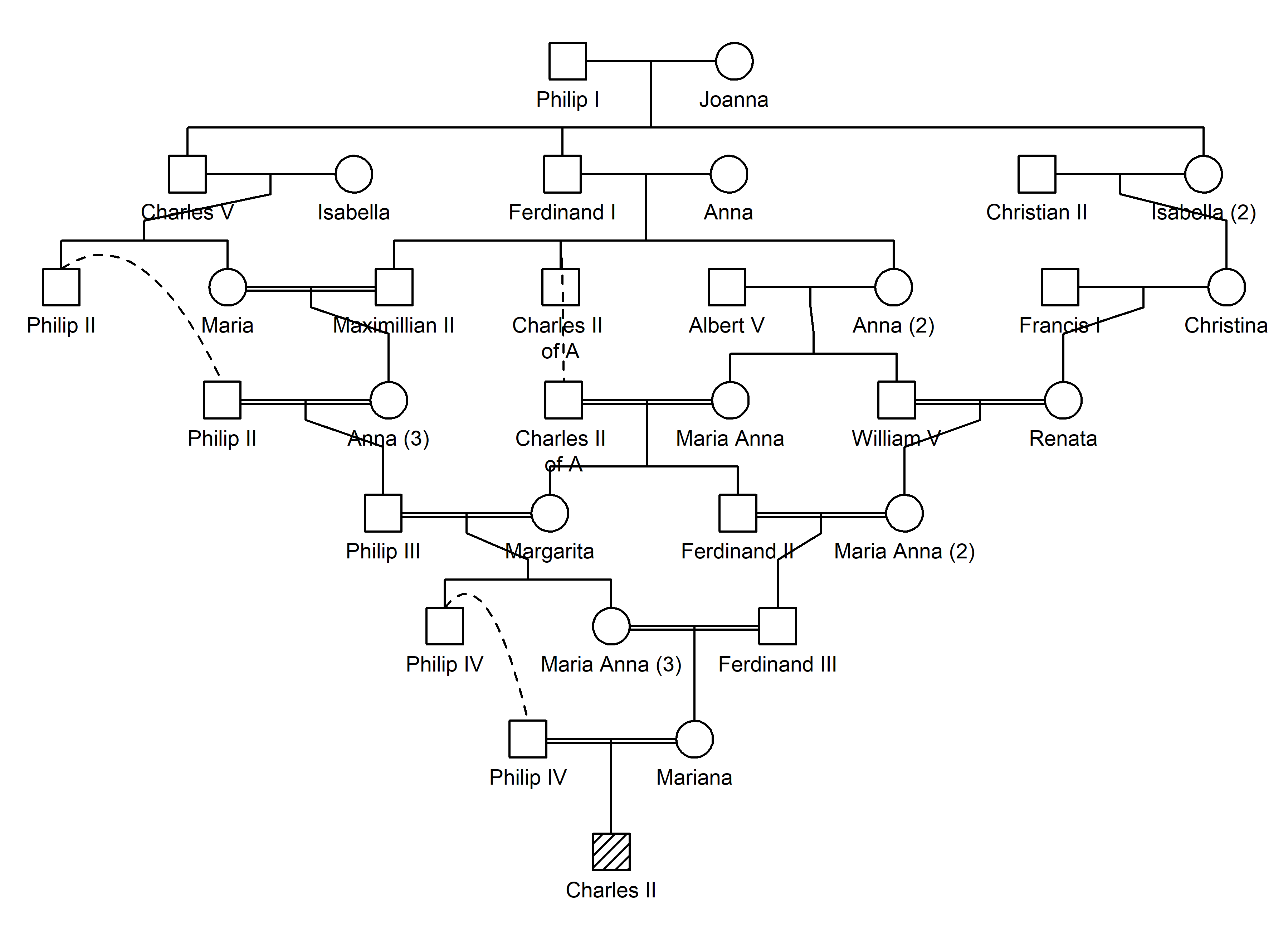 #> Philip IV-Philip III-Anna (3)-Maria-Charles V-[Philip I,Joanna]-Ferdinand I-Charles II of A-Margarita-Maria Anna (3)-Mariana