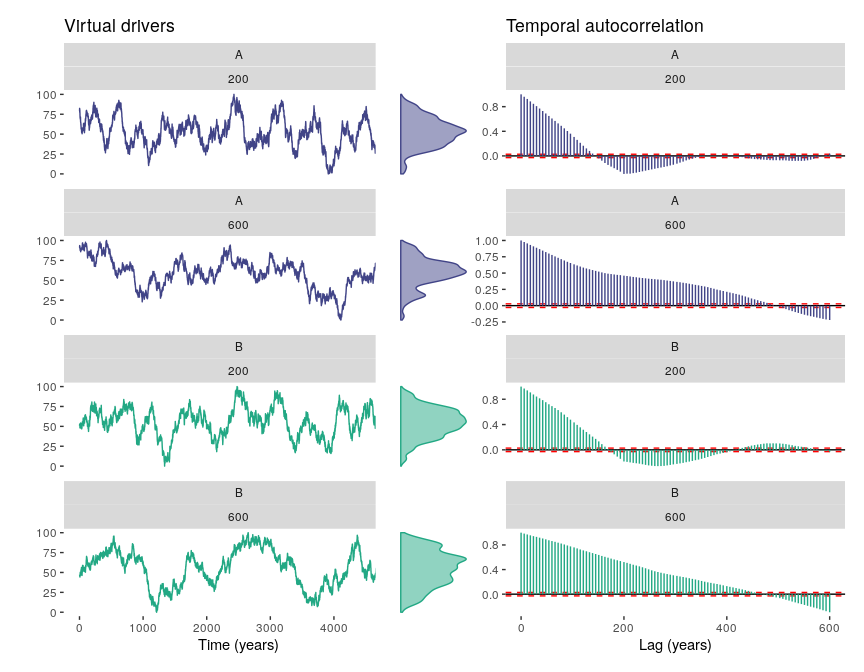 1. Generate virtual drivers with simulateDriverS. The user can define a random seed, a time vector, length of the autocorrelation structure of the driver, minimum and maximum values, and names of the drivers. Note that the final length of the temporal autocorrelation is only approximate, and that time runs from left to right, meaning that older samples have lower time values.