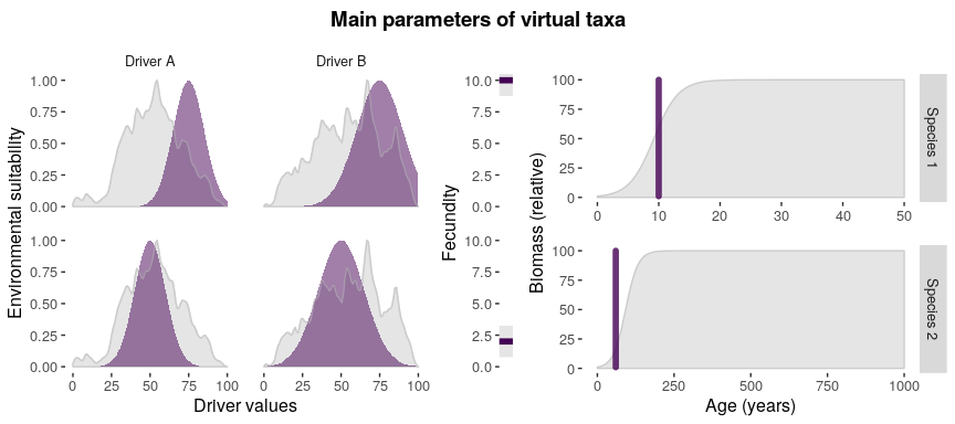 #with the function simulateDriver as well2. Define the traits of the virtual taxa. Note that the dataframe with the parameters can be either filled with numeric vectors, or manually, by using the function editData. Please, check the help of the function parametersDataframe and the vignette to better understand the meaning of the traits.