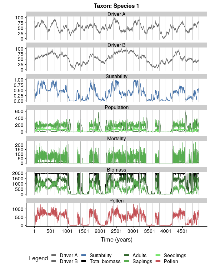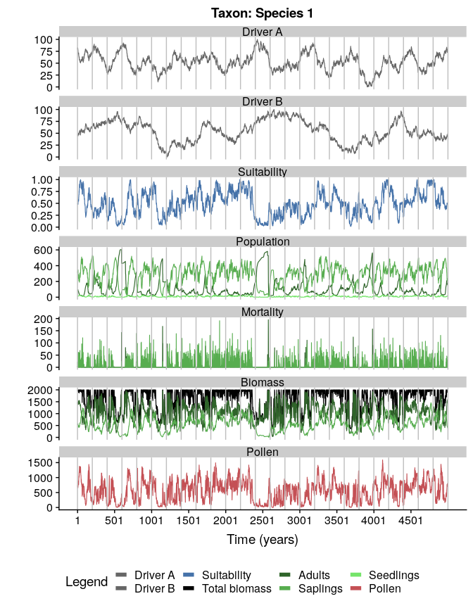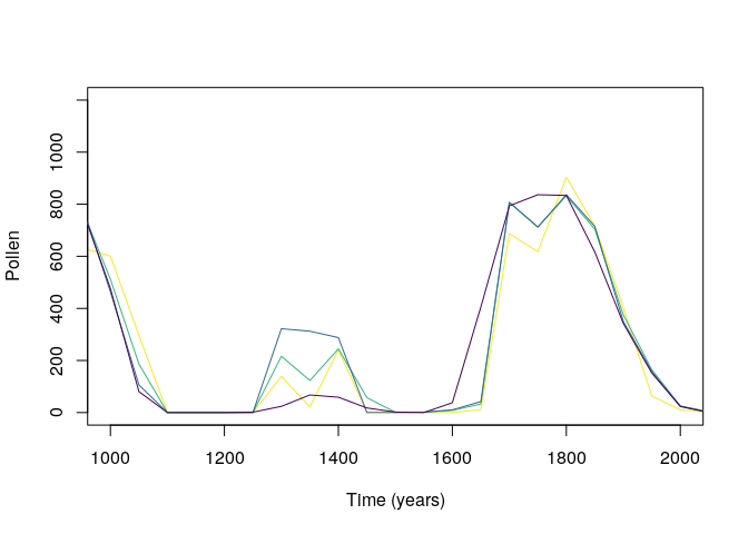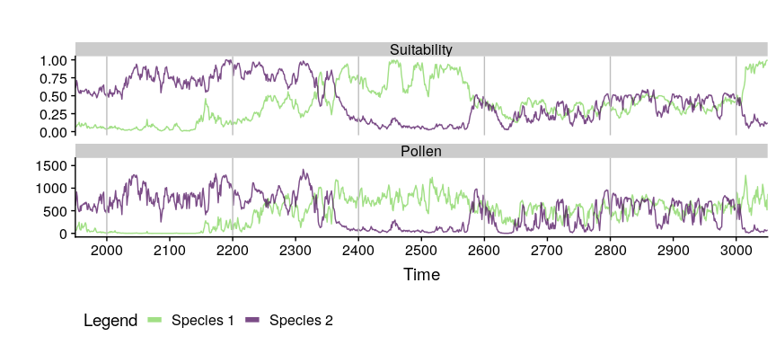 The goal of virtualPollen is to provide the tools to simulate pollen curves over millenial time-scales generated by virtual taxa with different life traits (life-span, fecundity, growth-rate) and niche features (niche position and breadth) as a response to virtual environmental drivers with a given temporal autocorrelation. It furthers allow to simulate specific data properties of fossil pollen datasets, such as sediment accumulation rate, and depth intervals between consecutive pollen samples. The simulation outcomes are useful to better understand the role of plant traits, niche properties, and climatic variability in defining the shape of pollen curves.